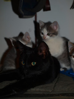 Ja sitten meidän kissakakarat. Mainiot satulahuoneen asukit, jotka toivottavat jokaisen tulijan tervetulleeksi. Joskus joudun laittamaan kaikki houkuttelutaitoni peliin, saadakseni pienet ratsastajat satulahuoneesta taas tallin puolelle. Sen verran valloittavia ovat nämä vauvat. Toki tämä musta, Jaska-kissa ei kuulu samaan pentueeseen, vaan on syntynyt jo alkukesästä. Pienet kolme pentua syntyivät syyskuun alussa. Kissoista riittäisi juttua vaikka kuinka.